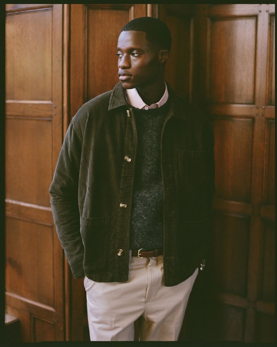 「私はJ.PRESSとともに育ってきました」とカールソンは語ります。「ハーバード・スクエアの店舗によく通い、自分用に初めて購入したスーツ、シャツ、ネクタイ、ベルトの多くはJ.PRESSでした。今でもそれらを大切にしています。今回の自身の役割は、多くの意味で故郷に帰ってきたような感覚です。ボタンダウンシャツ、カーキのパンツ、ブレザー、シャギードッグ。J.PRESSには、自分の感性に響くちょっとした遊び心を持つ一面もあるのです。そうしたすべてを尊重し、それを軸にシーズンごとのコレクションやコラボレーションを展開し、より多くの人々と分かち合いたいと思っています。J.PRESSはまさにひとつの確立された存在で、多くの意味で唯一無二のものなのです。」