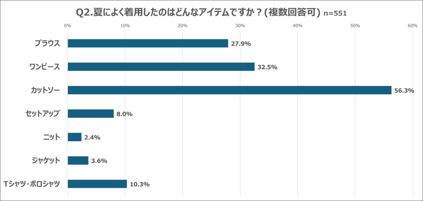 「夏によく着用したのはどんなアイテムですか?(複数回答可)」という質問に対し、「カットソー」(56.3%)、「ワンピース」(32.5%)、「ブラウス」(27.9%)が上位に挙がりました。いずれも涼しく、1枚で着こなしが完成するアイテムが多く選ばれており、女性にとって「着回しやすさ」と「お手入れのしやすさ」を兼ね備えた服が支持されていることがうかがえます。