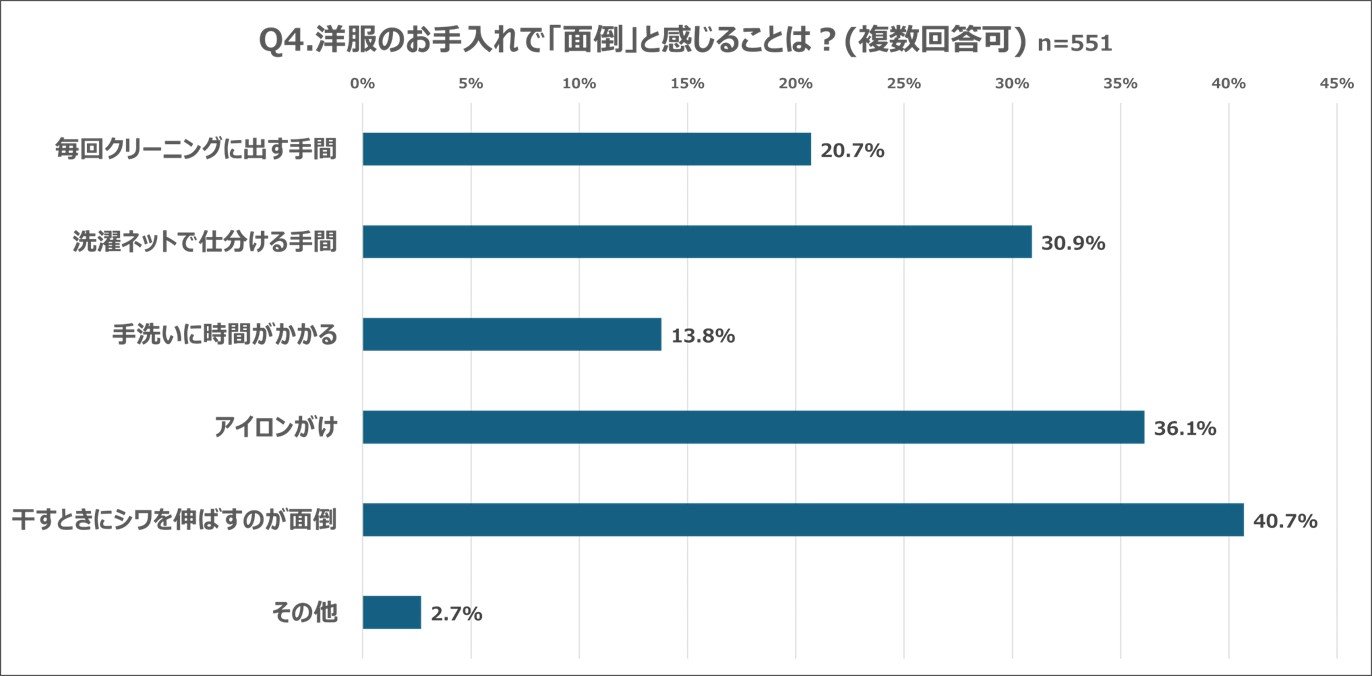 「洋服のお手入れで『面倒』と感じることは?」という質問に対し、「干すときにシワを伸ばす」(40.7%)、「アイロンがけ」(36.1%)が上位に挙がりました。日常的なお手入れの負担は"シワ対策"や"アイロンがけ"といった"見た目を整える作業"に集中しており、『清潔感のなさ』や『だらしなさ』といった印象につながる要素として、多くの人が気を配っていることが明らかになりました。