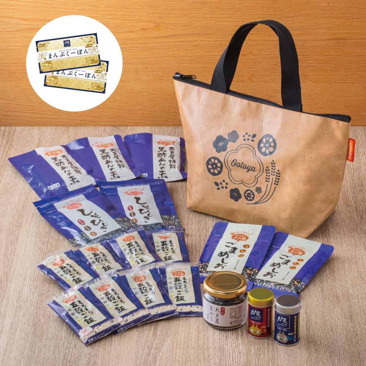 米袋をイメージしたクラフト調の普段使いにぴったりなお弁当バッグです。大戸屋の人気商品をイメージした稲やレンコン、お正月らしいお花をモチーフにした大戸屋オリジナルロゴをデザインしました。