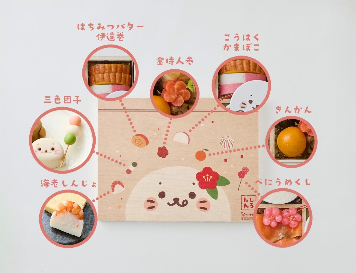 おせち料理と連動!描き下ろしオリジナルイラストが魅力。お重の蓋には、実際のおせち料理の品々をモチーフにしたイラストを散りばめた、本おせち限定のオリジナルデザインを採用しました。花飾りをつけたしろたんが、その料理を愛らしく舌を出して眺める、描き下ろしイラストです。