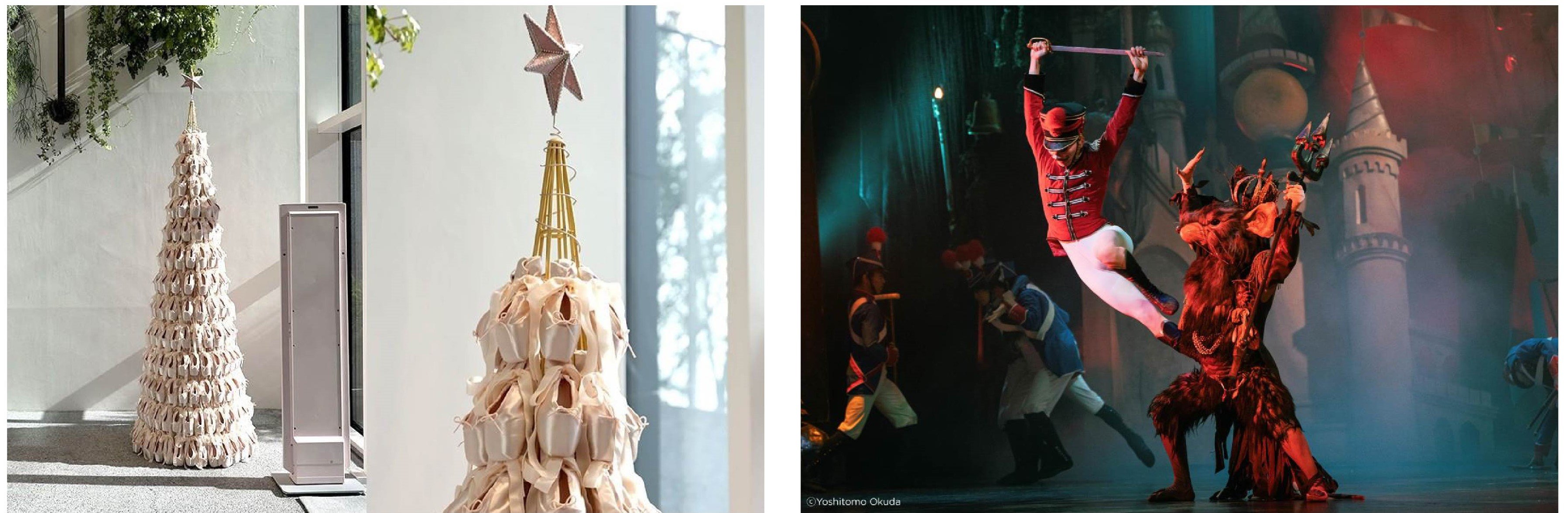 代官山本店フォトスポットとして賑わうトゥシューズアートツリーは、当社の生産過程で廃棄対象となったトゥシューズを再利用したもの。約150足から成る高さ2.5メートルのツリーは圧巻です。今年は新たに、ふんわりとチュチュが咲くような"チュチュツリー"も登場し、店内をより幻想的に彩ります。また、日本を代表する各バレエ団による『くるみ割り人形』の舞台写真の展示をはじめ、K-BALLET TOKYOの公演衣装展も開催します。