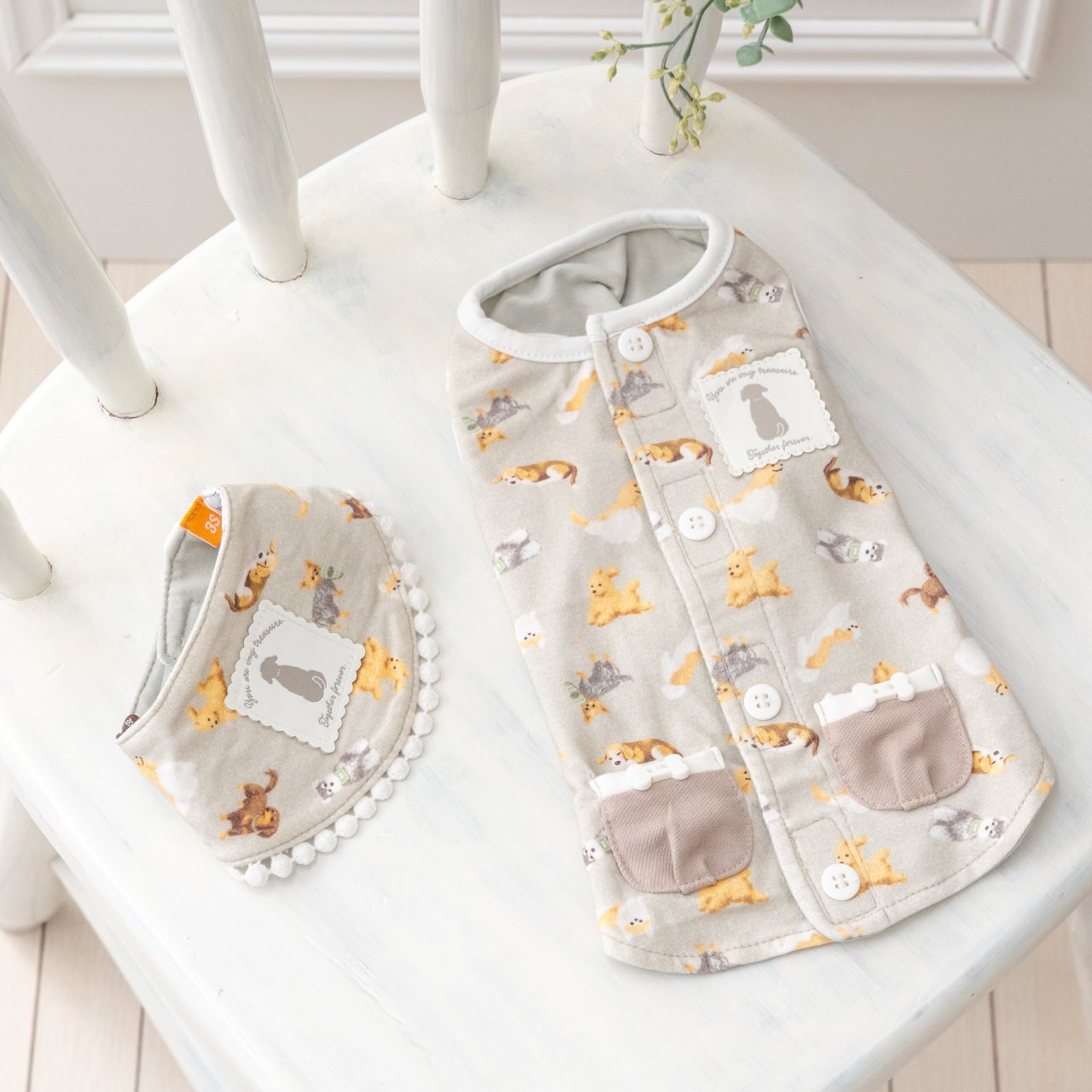 ウェアは、背中開き仕様のベストタイプで、洋服を着るのが苦手なワンちゃんや、体の動きが不自由なシニア犬でも着せやすいデザインで、簡単に着脱できるバンダナタイプもラインアップしています。シンプルで、おうちの中でも違和感なく着用いただけます。