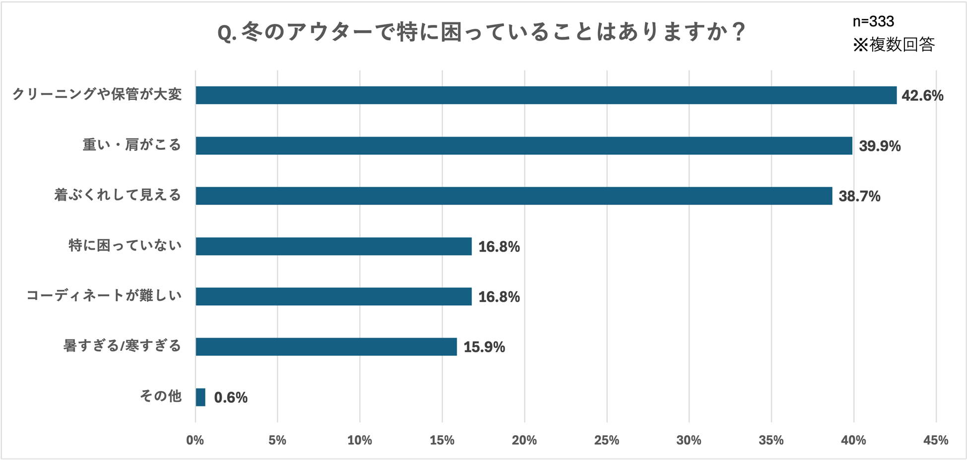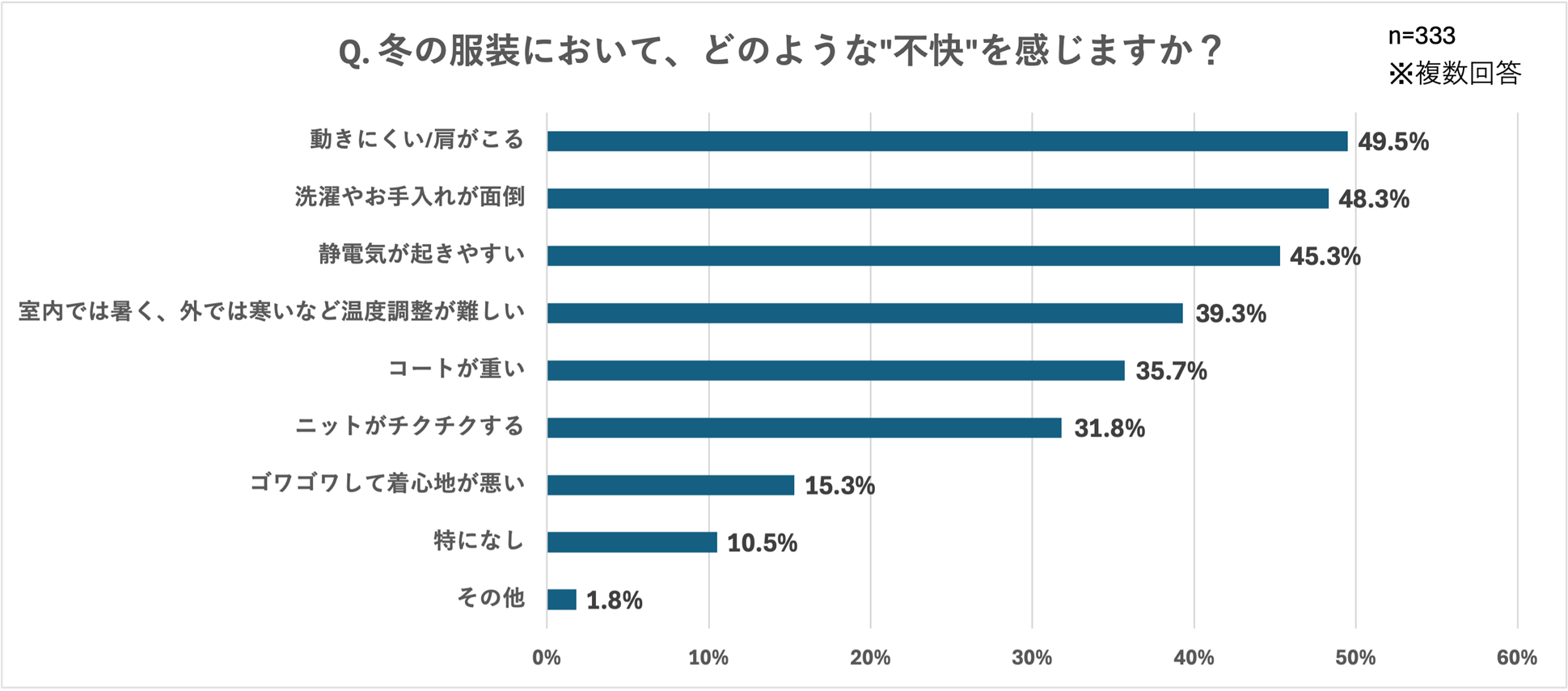 また、「冬の服装において、どのような"不快"を感じますか?」という質問には、「動きにくい/肩がこる(49.5%)」と約半数の人が回答しており、さらに「冬のアウターで特に困っていることはありますか?」という質問に対しても「重い・肩がこる(39.9%)」や「着ぶくれして見える(38.7%)」など、着心地に関する悩みが多いことがわかりました。