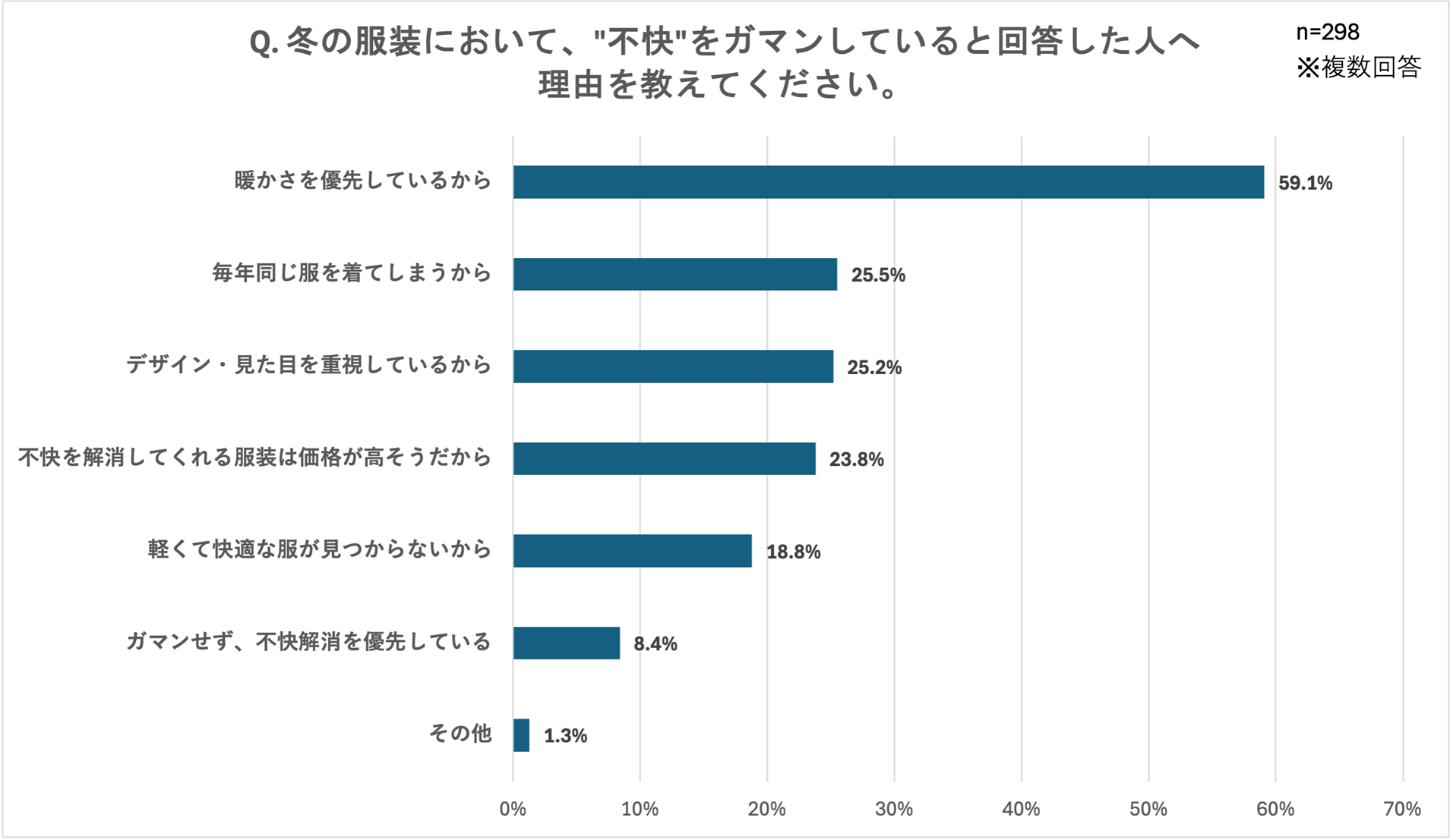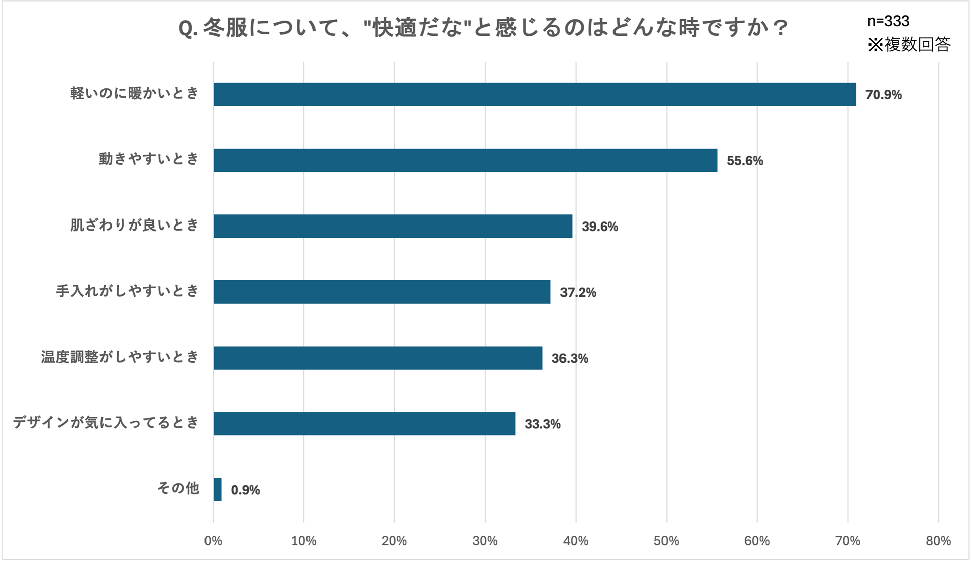ここまで、冬の服装において不快さを感じているものの防寒も欠かせない、といった声が多いことが明らかになりましたが、さらに「"不快"をガマンしている理由を教えてください。」という設問には、「暖かさを優先しているから(59.1%)」が最多となりました。また、「冬服について、"快適だな"と感じるのはどんな時ですか?」という設問では、「軽いのに暖かい時(70.9%)」が最多となり、これらの結果から、冬服選びにおける「暖かさ」と「快適さ」という、一見ジレンマの関係にある両立を求める声が強く浮き彫りになりました。