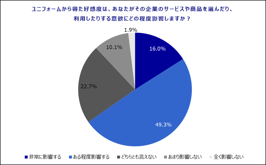 「ユニフォームから得た好感度は、あなたがその企業のサービスや商品を選んだり、利用したりする意欲にどの程度影響しますか?」という設問に対し、「非常に影響する(16%)」「ある程度影響する(49.3%)」と回答した人が65.3%を占め、ユニフォームから得た好感度がサービスや商品の購買・利用に影響することが判明しました。