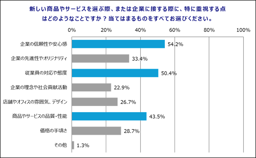 新しい商品やサービスを選ぶ際、または企業に接する際に、特に重視する点について質問したところ、最も多かった回答は「企業の信頼性や安心感」(54.2%)、次いで「従業員の対応や態度」(50.4%)、「商品やサービスの品質・性能」(43.5%)となりました。「商品やサービスの品質・性能」よりも「企業の信頼性や安心感」が多い結果となり、企業ブランディングの重要性が明らかになりました。