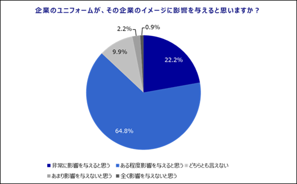 「企業のユニフォームが、その企業のイメージに影響を与えると思いますか?」という設問に対し、「非常に影響を与えると思う(22.2%)」「ある程度影響を与えると思う(64.8%)」と回答した人が87%を占めました。ユニフォームが企業イメージに大きな影響を与えることがわかりました。