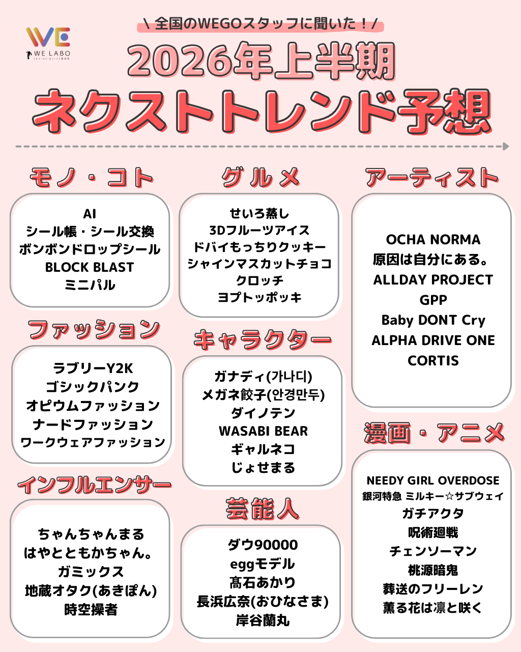 2026年上半期に流行りそうなネクストトレンドを見つけるべく、全国のWEGOスタッフに大調査を実施し、インフルエンサー、漫画・アニメ、ビューティーなど、さまざまなジャンルから「これは来る!」と噂のコンテンツをスタッフのコメントと共にご紹介しています。