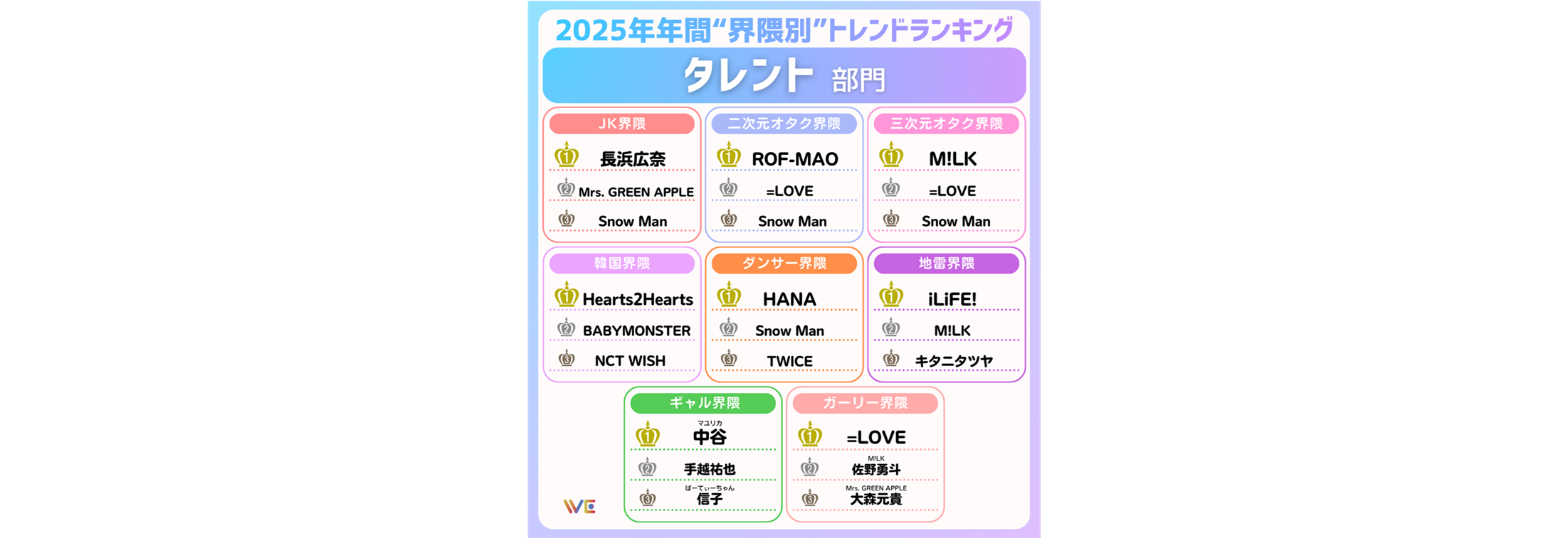 WE LABOでは、Z世代の消費動向を「界隈」ごとに細分化し、SNSコミュニティを活用した大規模調査を実施。総フォロワー数60万人を超える8つの界隈(「JK界隈」「二次元オタク界隈」「三次元オタク界隈」「韓国界隈」「ダンサー界隈」「地雷界隈」「ギャル界隈」「ガーリー界隈」)のデータを分析し、2025年年間のトレンドを界隈別10部門に分けてランキング化しました。