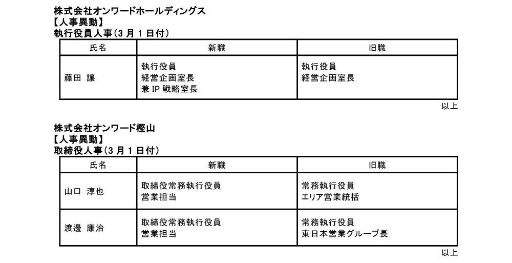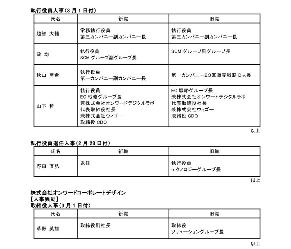 株式会社オンワードホールディングス(本社:東京都中央区 代表取締役社長:保元 道宣)は、2026年3月1日付で当社の人事異動、および2月28日・3月1日付で株式会社オンワード樫山の人事異動、ならびに3月1日付で株式会社オンワードコーポレートデザインの人事異動を行いますのでお知らせいたします。
