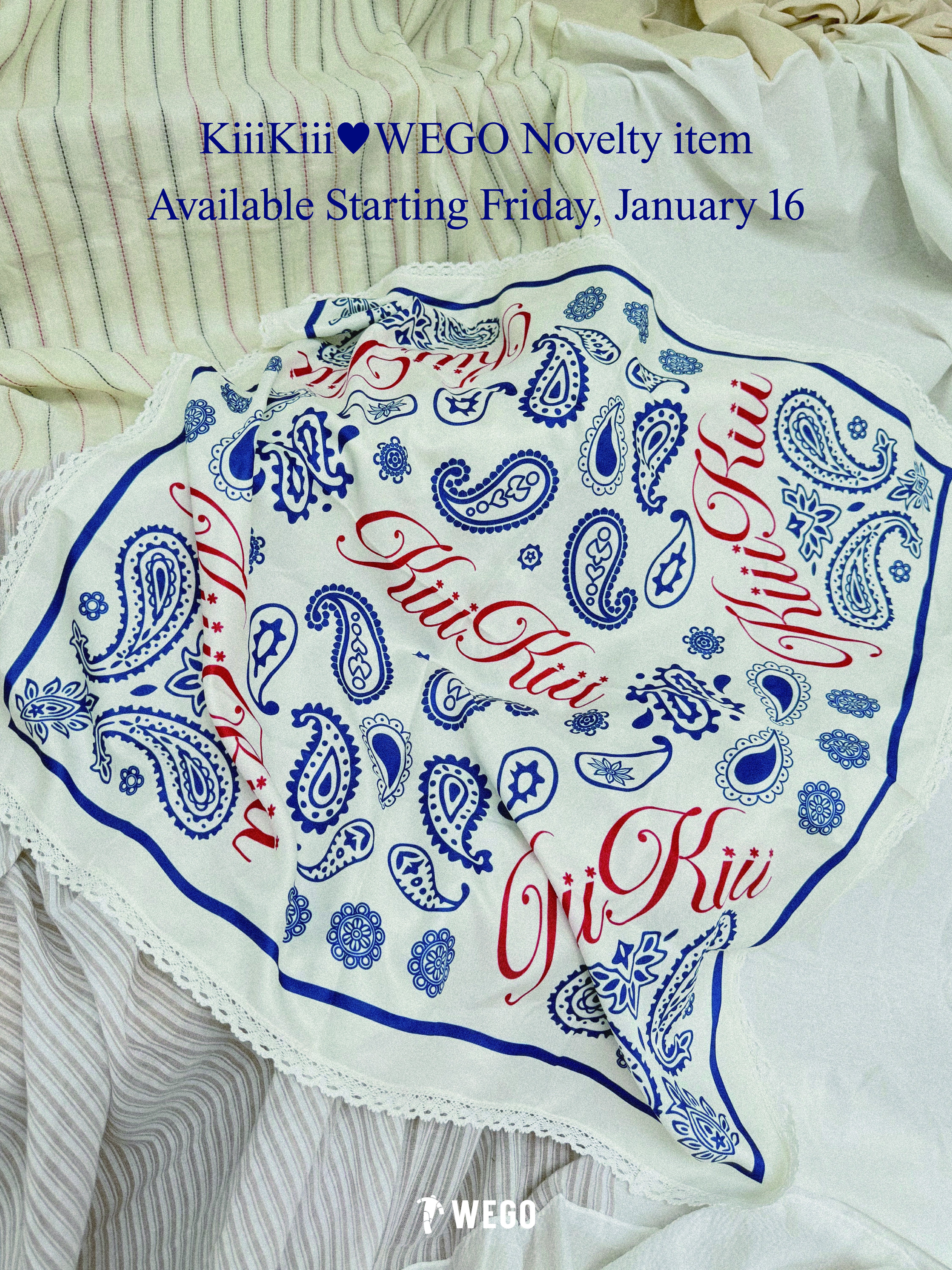 1月16日(金)から、WEGO全店舗にて店内商品を税込¥7,000-以上お買い上げの方に、今回の企画のために制作したオリジナルロゴデザインを使用したビッグサイズのスカーフをプレゼントいたします。ヘアアクセサリーとしてはもちろん、バッグやお洋服など、ご自身のお好きなアイテムに付けてお楽しみいただけます。