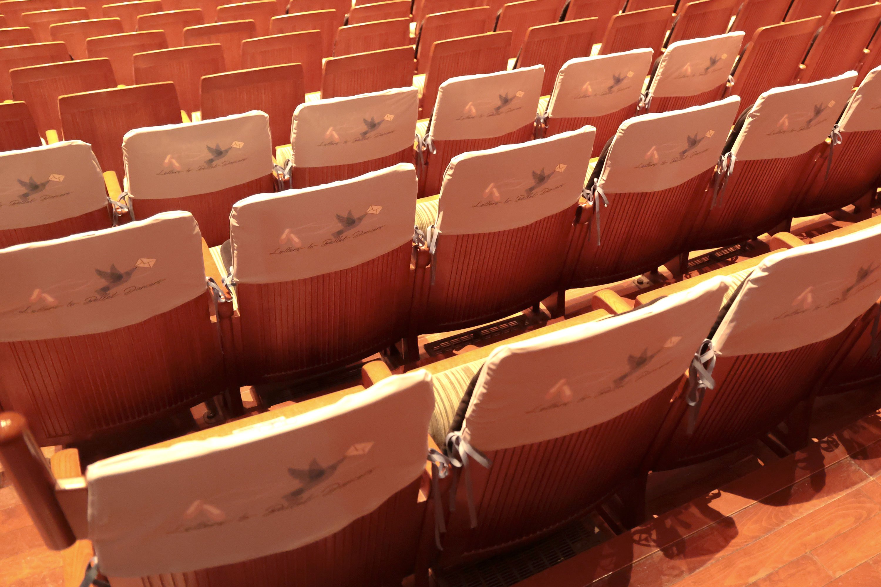 招待席には、「バレエみらいシート」限定の座席シートカバーを用意しました。公演終了後お持ち帰りいただき、バレエシューズを入れるのにぴったりな巾着として使用できるデザインです。
