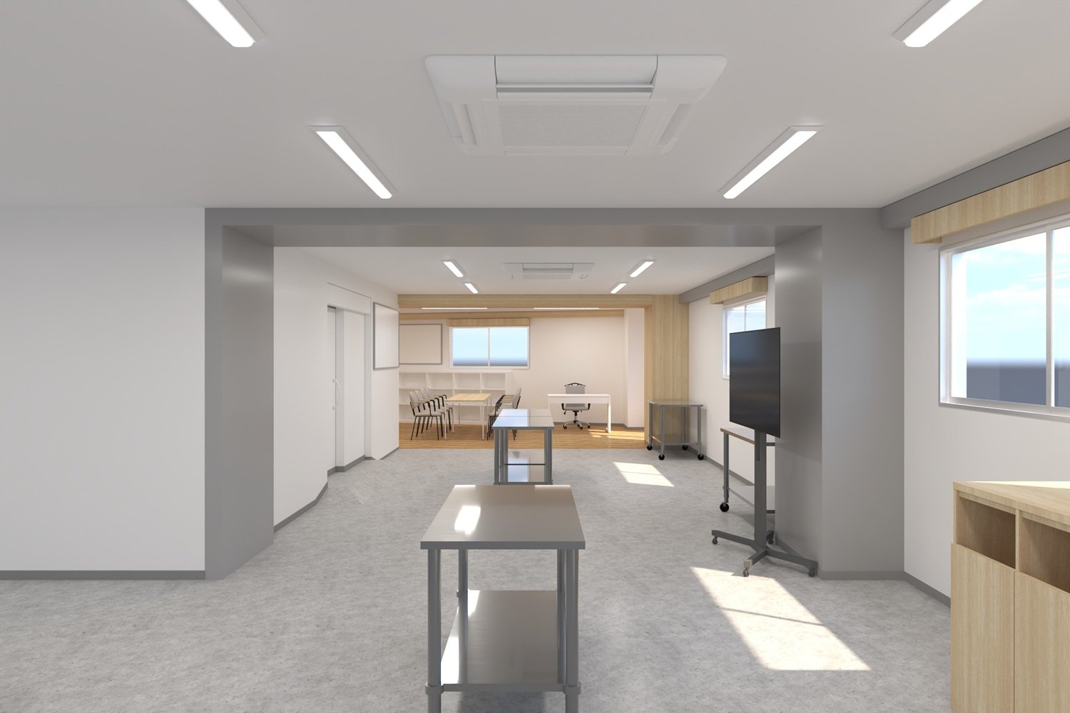 具体的には、これまで単一的で無機質だった空間を、作業効率の向上や居心地の良さを求めて、「作業スペース」と「事務・休憩スペース」の大きく2つの空間に分けました。「作業スペース」はすっきりとした石目調の床材を、「事務・休憩スペース」ではナチュラルな木目調の床材を使用することで空間要素を分け、メリハリをつけています。