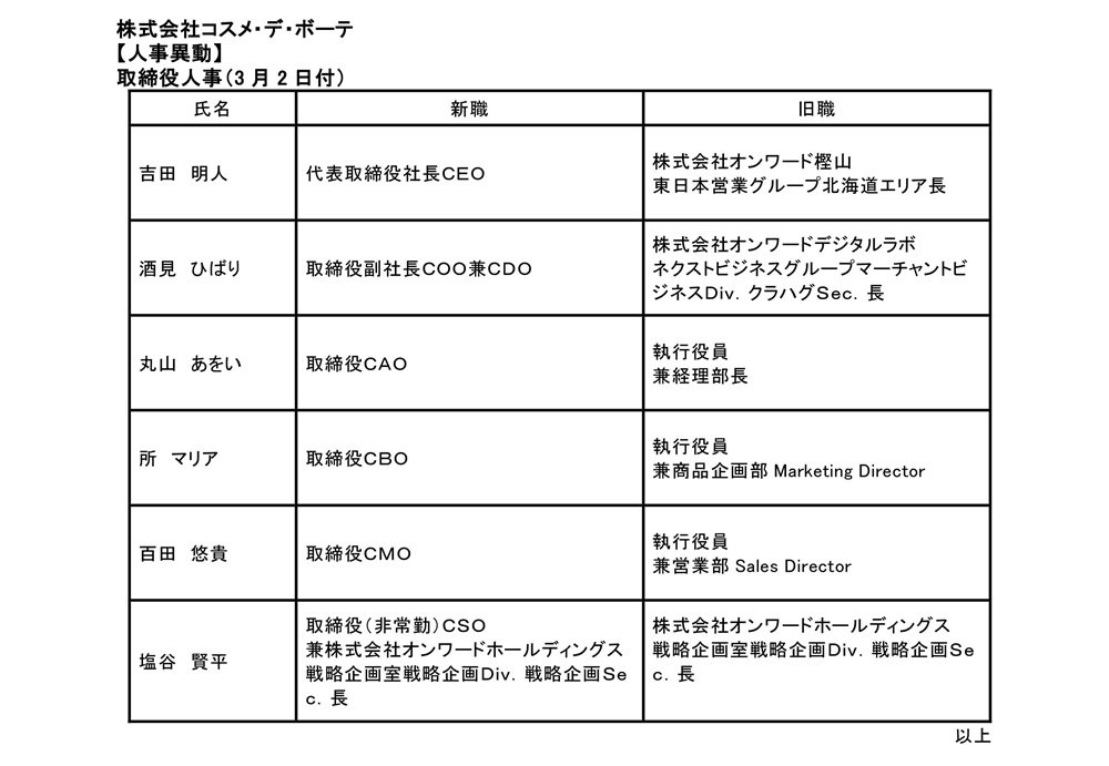 株式会社オンワードホールディングス(本社:東京都中央区 代表取締役社長:保元 道宣)は、2026年3月2日付で株式会社コスメ・デ・ボーテの人事異動を行いますのでお知らせいたします。
