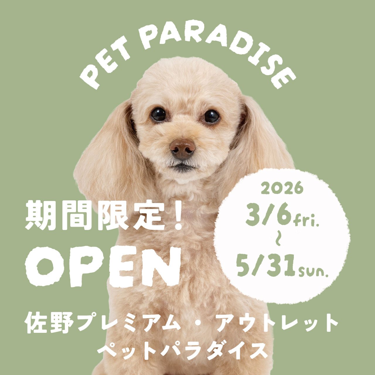 株式会社クリエイティブヨーコ(本社:長野県長野市 代表取締役社長:北原 武幸)は、2026年3月6日(金)から5月31日(日)までの期間限定で、栃木県佐野市の商業施設佐野プレミアム・アウトレット555区Premium Event Spaceに「ペットパラダイス 佐野プレミアム・アウトレット店」をオープンします。