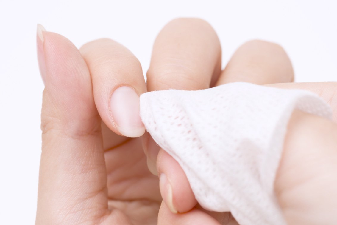 ネイルクリーナーやエタノールで爪の表面をふき取ります。エタノールをお持ちでない場合は、ハンドソープで爪を丁寧に洗って油分を取り除いてください。