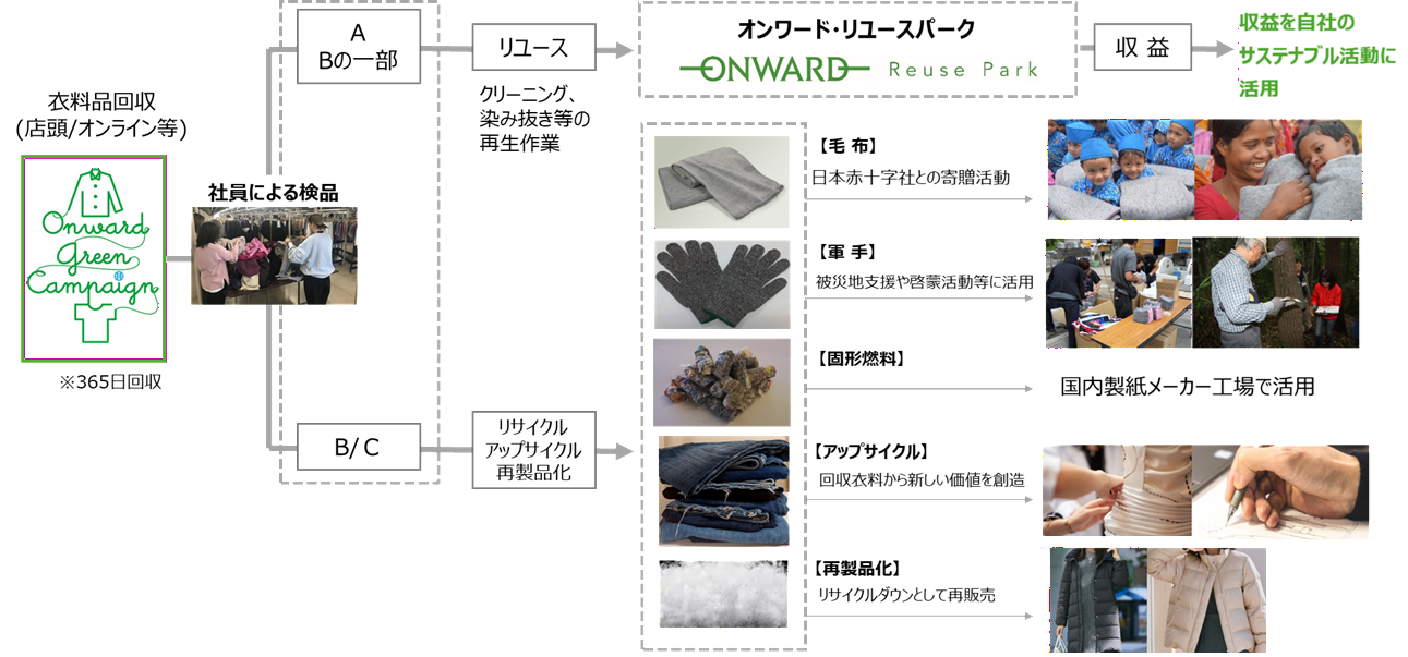 オンワードグループのサステナブル経営推進の一環として、ご愛用いただいた自社の衣料品を利用者から引き取り、可能な限りリユース・リサイクルすることを通じて、衣料品循環システムの構築を目指す取り組みです。