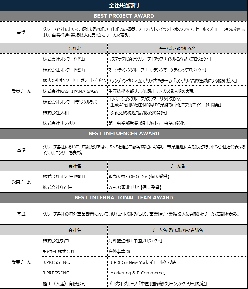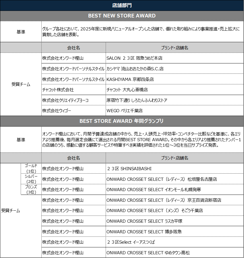 株式会社オンワードホールディングス(本社:東京都中央区 代表取締役社長:保元 道宣)は、2025年度に活躍した社員(チーム)を表彰する「2025年度オンワードグループ表彰式」を、4月23日(木)、東京都千代田区の東京會舘で開催しました。グループ社員総勢400名以上が参加し、各AWARD受賞50組のチームおよび個人を表彰しました。
