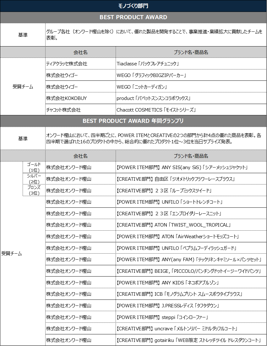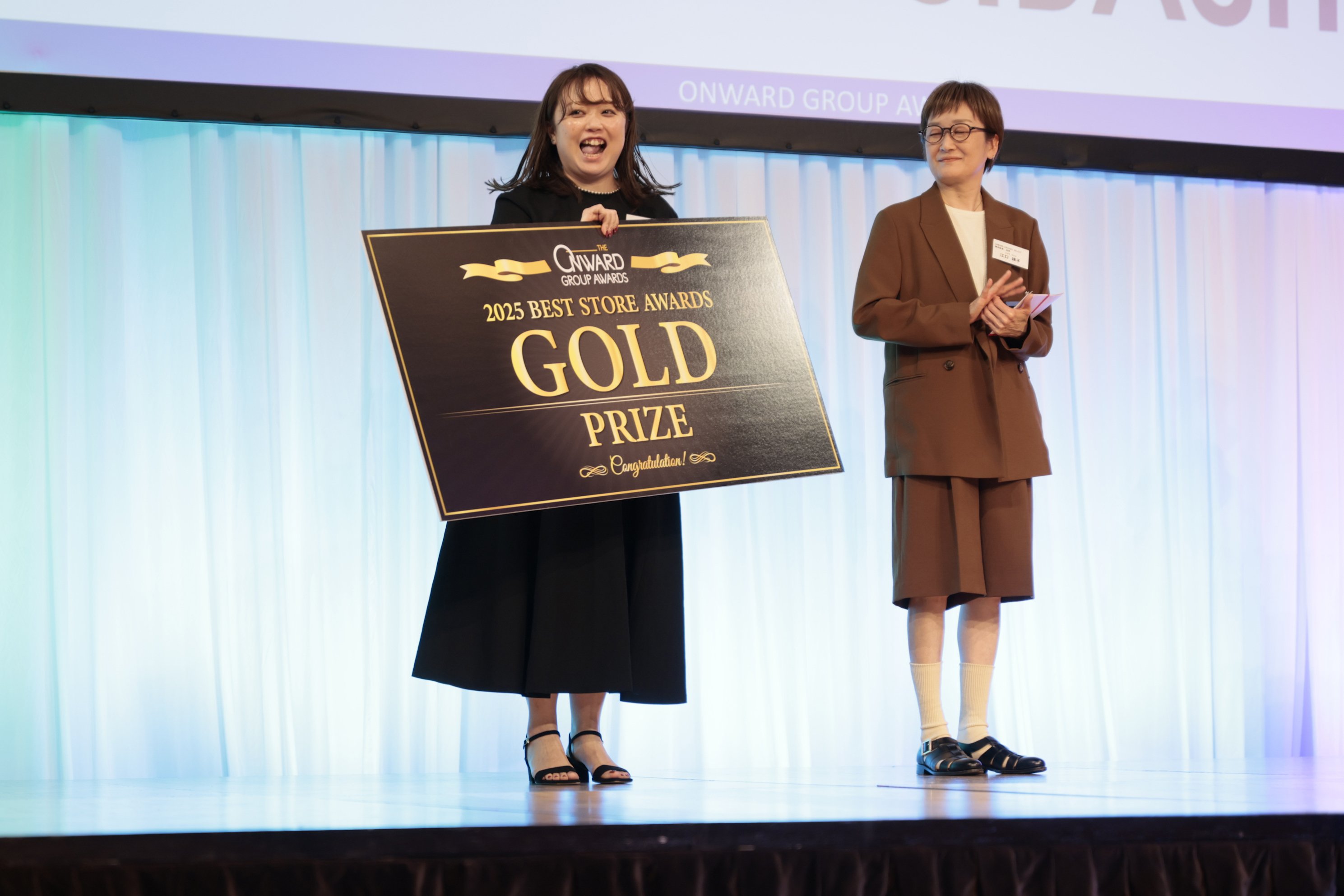 今回の表彰式は、"WAKU WAKU FUTURE(ワクワクフューチャー)"をテーマに開催しました。未来のオンワードへの期待を込め、大阪・関西万博開催、AIチャットの普及、女性首相誕生など時代が大きく進んだ2025年度に、成果を残した社員(チーム)を賞しました。50組のチームおよび個人の各AWARD受賞者はランウェイ形式で登場しステージ上で表彰されました。また、優れたプロダクトを表彰する「BEST PRODUCT AWARD 年間グランプリ」と、優れた店舗を表彰する「BEST STORE AWARD 年間グランプリ」では、上位3チームを当日にサプライズ発表しました。