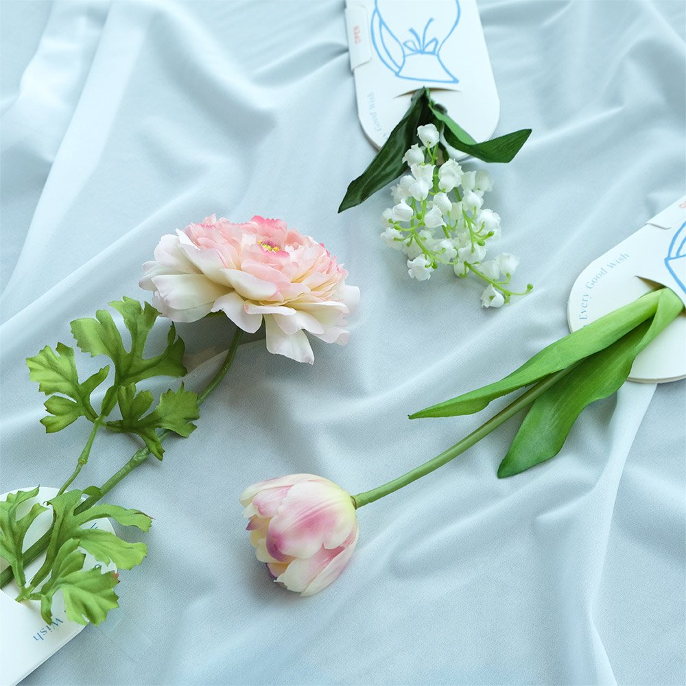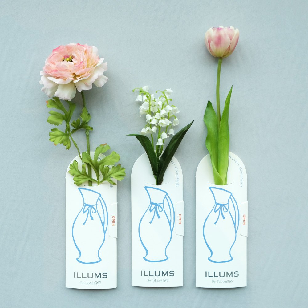 北欧ブランドを中心に取り扱う「ILLUMS」の世界観に合わせ、「ILLUMS by Bloom365」では、北欧の人々が日常的に楽しむ花のある暮らしをヒントに、空間にやさしくなじむ花々を用意しました。贈る方は、スズラン(ホワイト)、チューリップ (パープルクリーム)、ラナンキュラス(ライトピンク)の3種類の中から選ぶことができます。また、台紙に描かれているリボン付きの花瓶のイラストも本企画限定デザインです。
