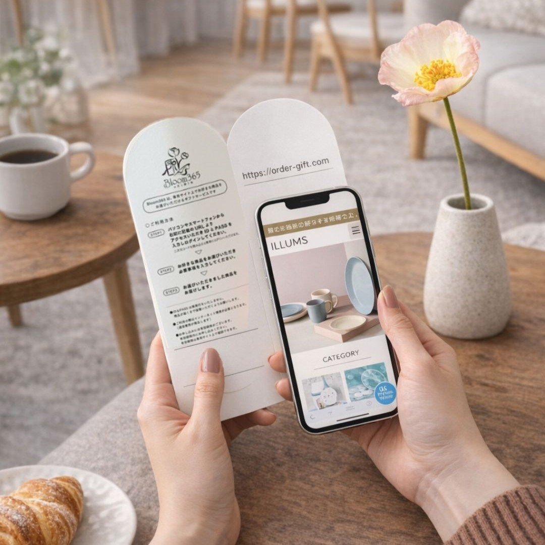 受け取った方は、台紙に記載された二次元コードからWEBカタログへアクセスし、「ILLUMS e-order gift」より好きな商品を選ぶことができます。